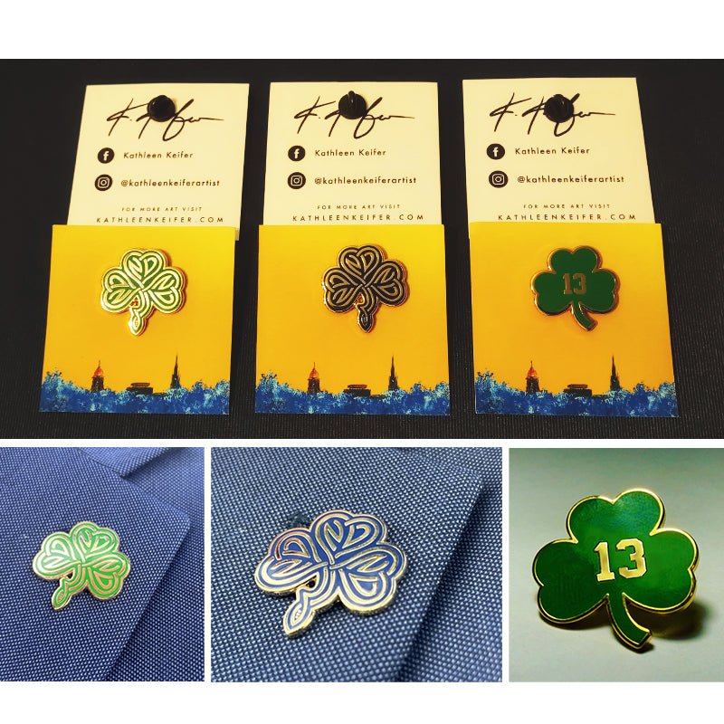 Get these limited edition pins by Kathleen Keifer! They have become collector items and are only offered for sale exclusively through Legion of the Leprechaun at this time. If you missed out on the official launch through Kathleen, now is your chance to secure yours before they are gone. The set includes two Celtic knot pins in Navy and Gold and one Lucky 13 Green and Gold pin. Perfect for apparel, hats, suits, ties, or anything you want to pin!
